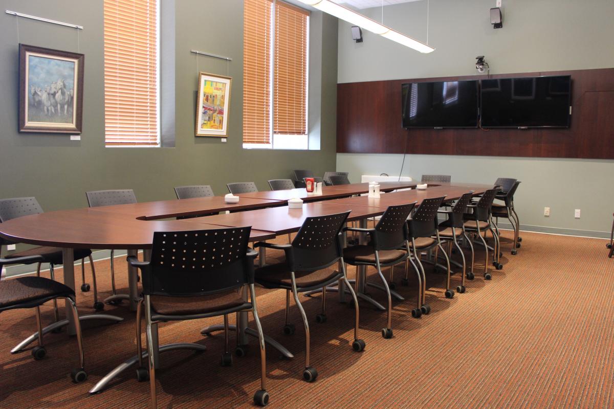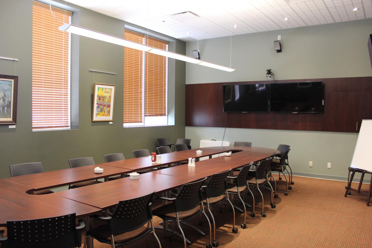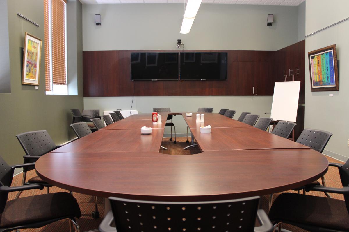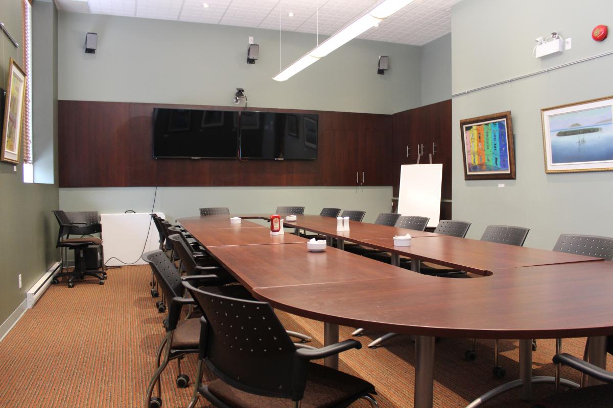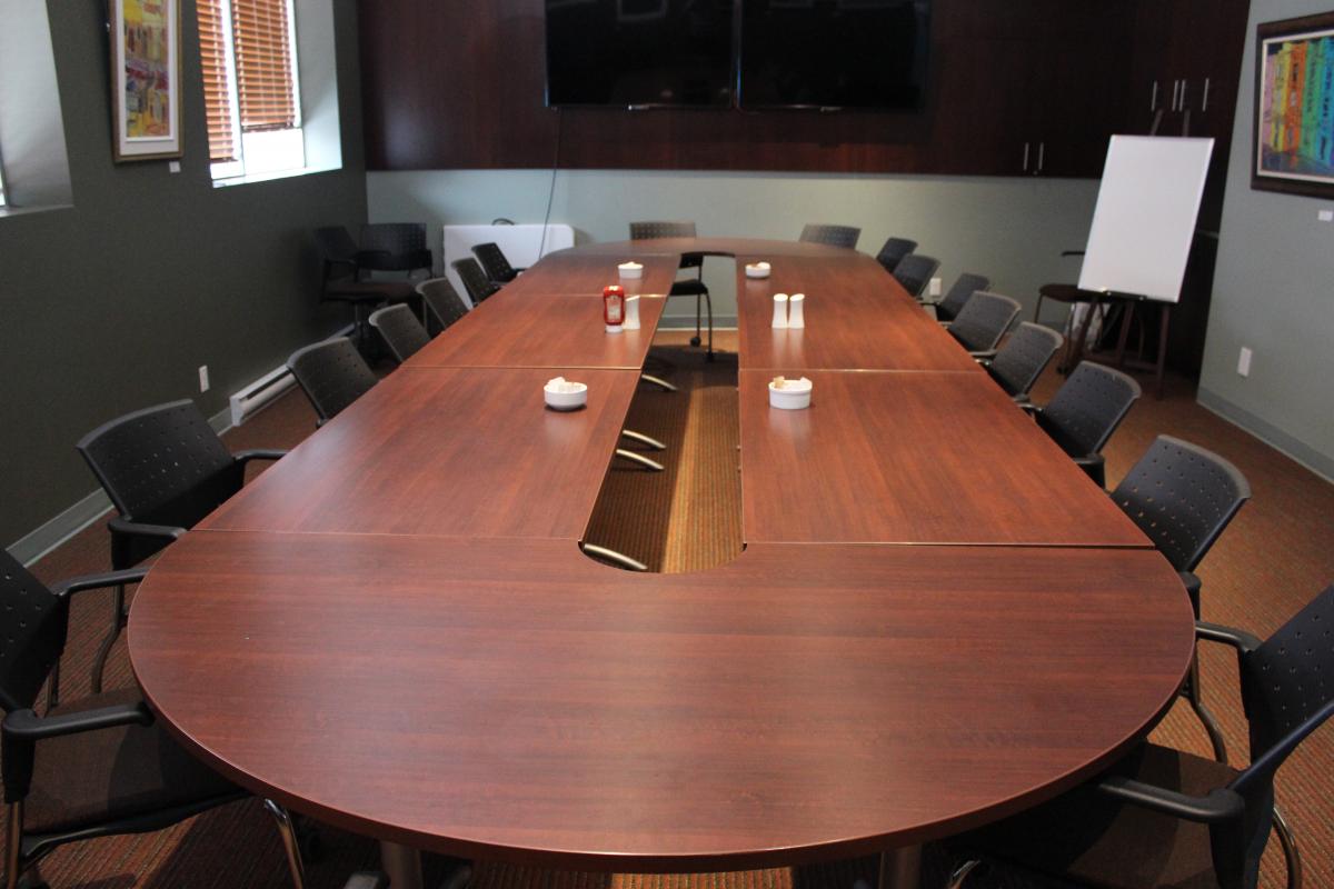 Une magnifique salle disponible à Rimouski pour tous vos besoins avec une capacité de 20 personnes. Nous offrons des chaises ergonomiques, une table moderne en bois avec deux téléviseurs Full HD et un système de son de haute qualité. Faites de vos conférences de presse, vos réunions ou vos assemblées générales un succès avec la location de notre salle !